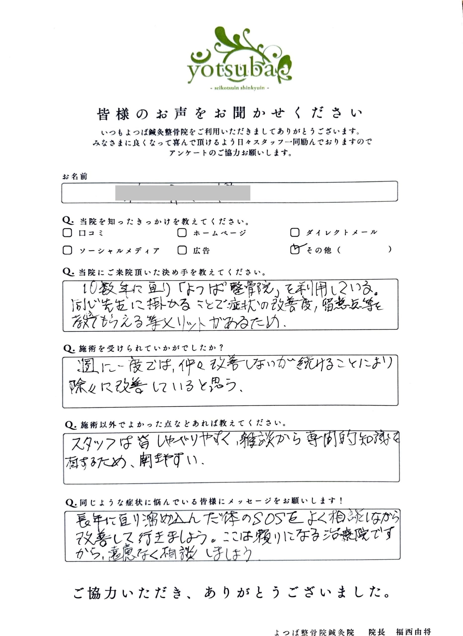 A.10数年に亘り「よつば整骨院」を利用している。 同じ先生に掛かることで症状の改善度、留意点等を教でもらえる等メリットがあるため