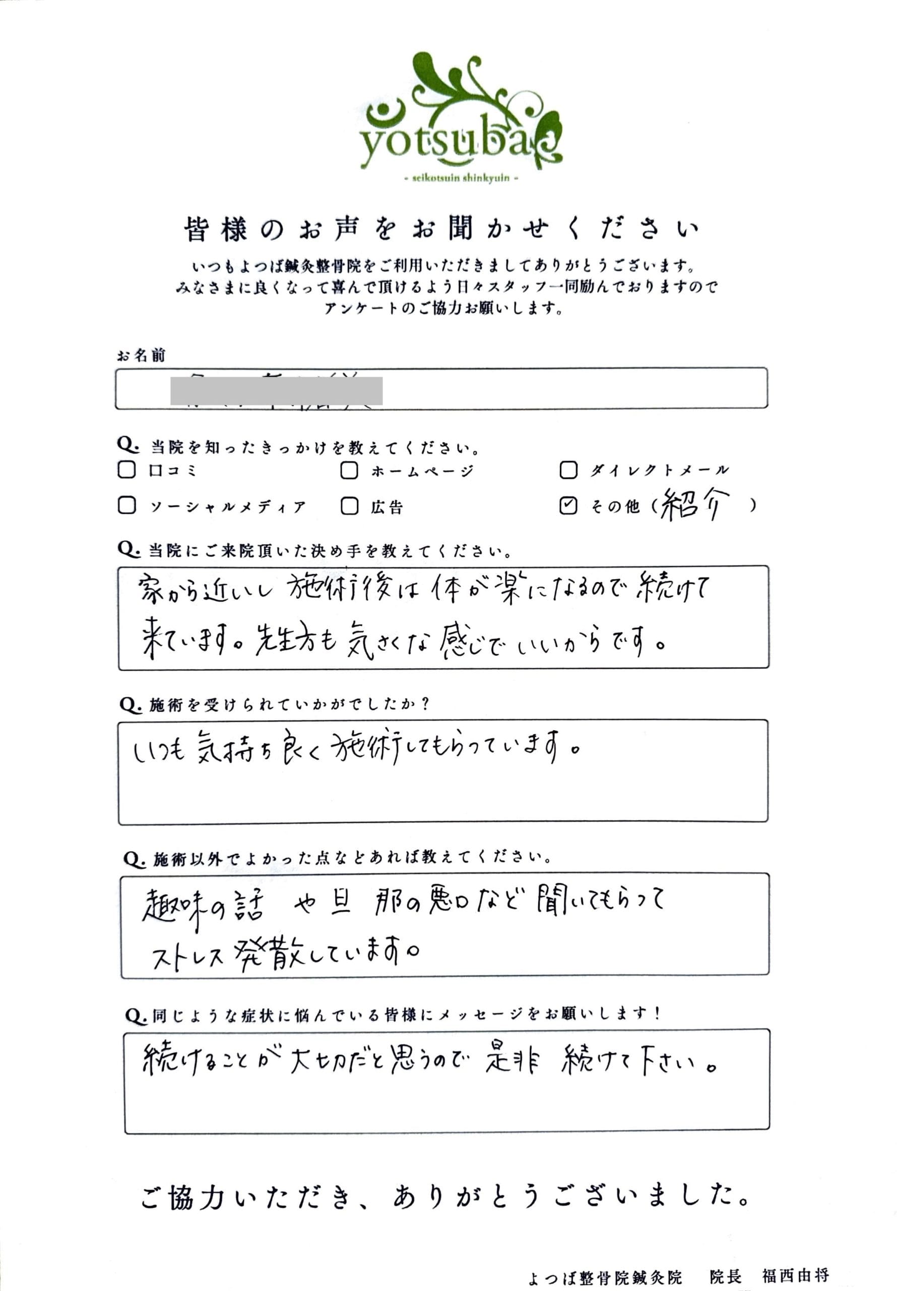 A.家から近いし施術後は体が楽になるので続けて来ています。